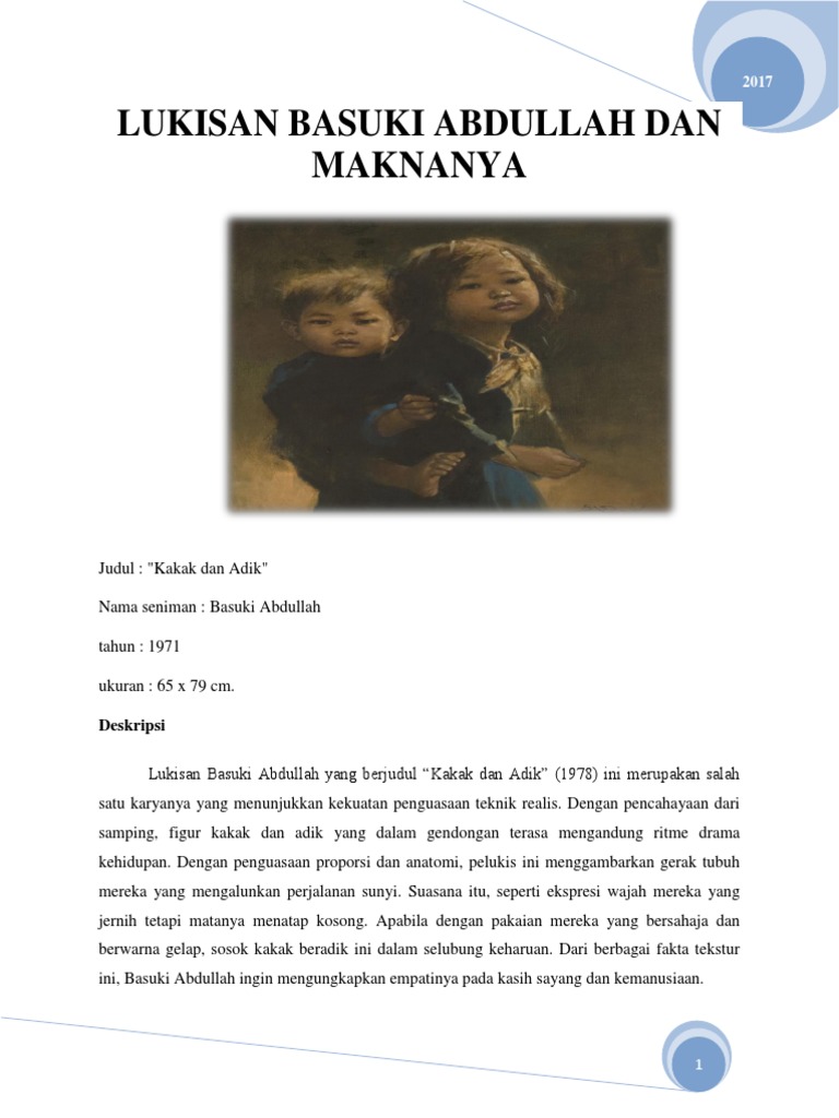 Fransiskus Xaverius Basuki Abdullah lahir di Surakarta Jawa Tengah Hindia Belanda 25 Januari 1915 meninggal di Jakarta Indonesia 5 November 1993 pada umur 78 tahun adalah salah seorang maestro pelukis IndonesiaIa dikenal sebagai pelukis aliran realis dan naturalis. Deskripsi Lukisan Kakak dan Adik karya Basuki Abdullah menunjukan kekuatan penguasaan teknis realistis yang sangat baik pola pencahayaan menggunakan pencahayaan dari samping kiri posisi obejek lukisan atau samping kanan posisi penikmat lukisansiapapun pasti setuju bahwa sosok kakak dan adik dalam lukisan ini mengandung makna yang. Dalam lukisan yang dibuat tahun 1971 Basuki Abdullah menampilkan sosok dua orang anak kecil yaitu dua orang kakak beradik.